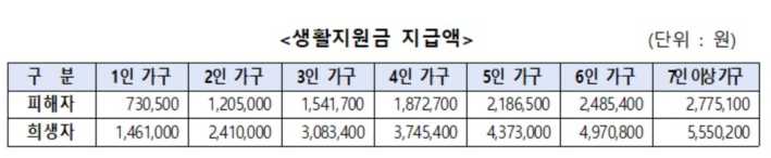 이번 생활지원금은 단순 희생자 개인이 아닌, 그와 같은 가구에 속한 구성원 전체를 대상으로 합니다.